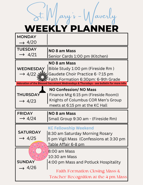 Welcome to St. Mary’s Catholic Church! Since the 1880’s, the Church of St. Mary’s has been an essential part of the Waverly community by bringing the sacraments and the teachings of the Church to thousands of people. Today, our parish family continues its mission of proclaiming the message of Jesus Christ and nourishing souls with the gifts of his presence and his grace.